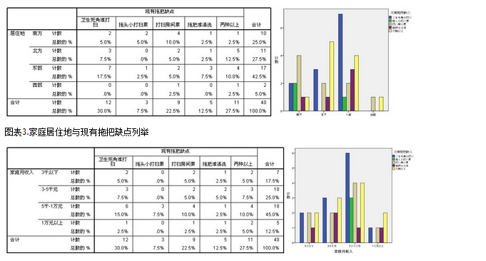 用户家庭居住地、月收入与家庭现有拖把缺点列举的相关分析见图表3和4。从中可以看出家庭现有拖把的缺点列举的顺序为:房间卫生死角难打扫>两种缺点以上>打扫房间很累>拖把自身很难清洗>拖把头小打扫面积大房间累,表明虽然现有拖把减轻了人们的拖地负担,但还是不够理想,人们普遍觉得拖地很累,因此应该设计一款电动智能拖把,并且自身容易清洗,大幅减轻人们的拖地负担。从现有拖把的最大缺点“房间卫生死角难打扫”(占30%)来看,东部地区值最大,西部最小,表明东部地区地少人多,房间结构复杂面积紧凑,死角难以清理,西部反之。因此在设计拖把时,最好能兼顾“头大死角难清理,头小大面积房间难打扫”的矛盾,设计一款可拆换大小拖把头的拖把。