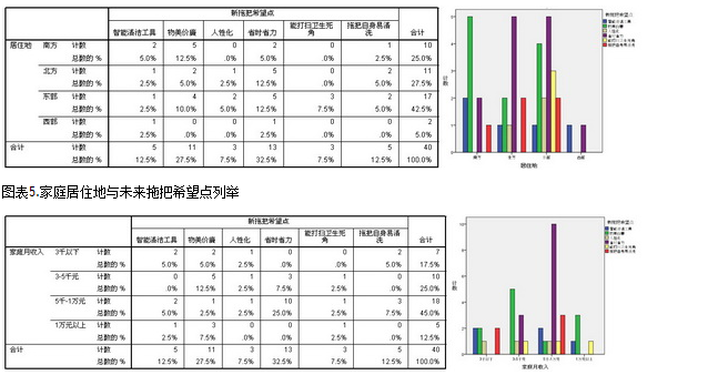 用户家庭居住地、月收入与家庭未来拖把希望点列举的相关分析见图表5和6。从中可以看出,人们对家庭未来拖把希望点的排序为:省时省力>物美价廉>智能清洁工具>拖把自身容易清洗>人性化>能打扫卫生死角,表明人们希望拥有一款省时省力的智能拖把,以减轻繁重的家务负担。南方地区对“物美价廉”诉求最高,东部和北方地区对“省时省力”诉求最高,表明相对南方来说,东部和北方家务负担更重,或者对拖把价格不敏感。
