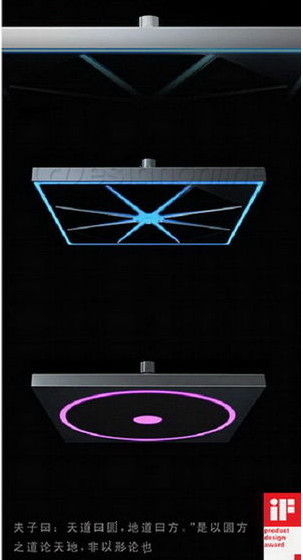 “星语”雨淋花洒的设计理念便来自于中国传统文化之天主圆地主方的思想。我追寻了中国人的思想中天地之间的水和光的和谐共生的根源,追寻中国人对天地之气的感召情节,赋予该产品人间方圆正气的产品寓意和方正大气产品形态。